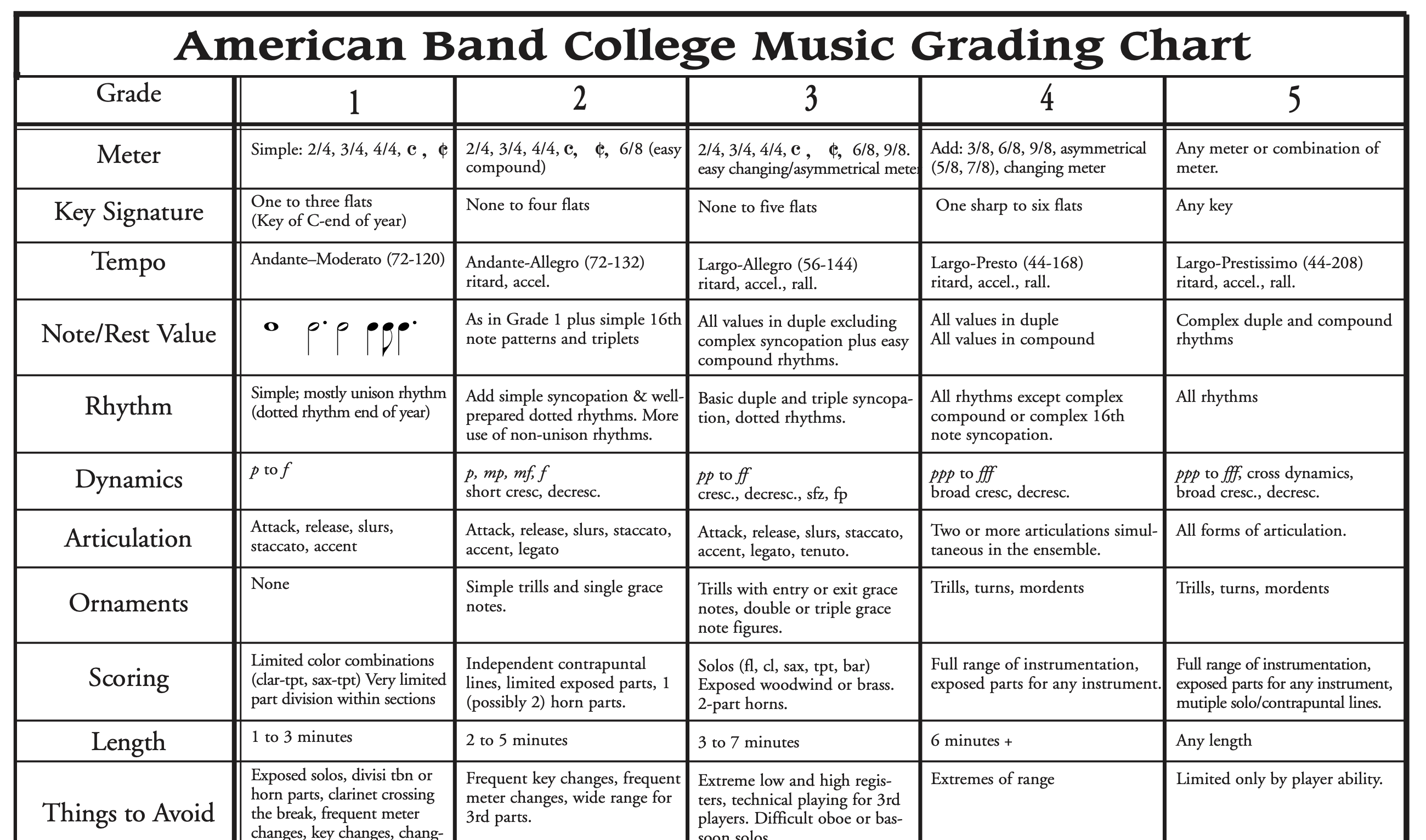 ด้วยเหตุนี้ นักประพันธ์เพลง สำนักพิมพ์ นักดนตรี นักการศึกษา วาทยกร มารวมตัวกันเพื่อศึกษาหาแนวทางร่วม และกำหนดสิ่งที่เรียกว่า “Grade Level”  หมายถึง  เกณฑ์วัดที่ใช้ “บอก” ระดับความยากง่ายของบทเพลง ซึ่งแน่นอนว่า สิ่งนี้เป็นเพียงเครื่องมือที่ใช้บอก ระดับความยากง่ายเฉยๆ ไม่ใช่สิ่งที่เอาไว้ กำหนดคุณค่า (Value) คุณภาพ (Quality)  หรือ ข้อได้เปรียบ (Privilege) แต่อย่างใด สรุปง่ายๆ มันเอาไว้บอกว่า เพลงมันยาก-ง่าย ประมาณไหนแล้วกัน เวลาเลือกเพลง จะได้พิจารณาถูกว่า เรา และ นักเรียนของเรามีทักษะอยู่ในระดับไหนที่จะสามารถเล่นเพลงตาม Grade Level ที่เหมาะสมได้